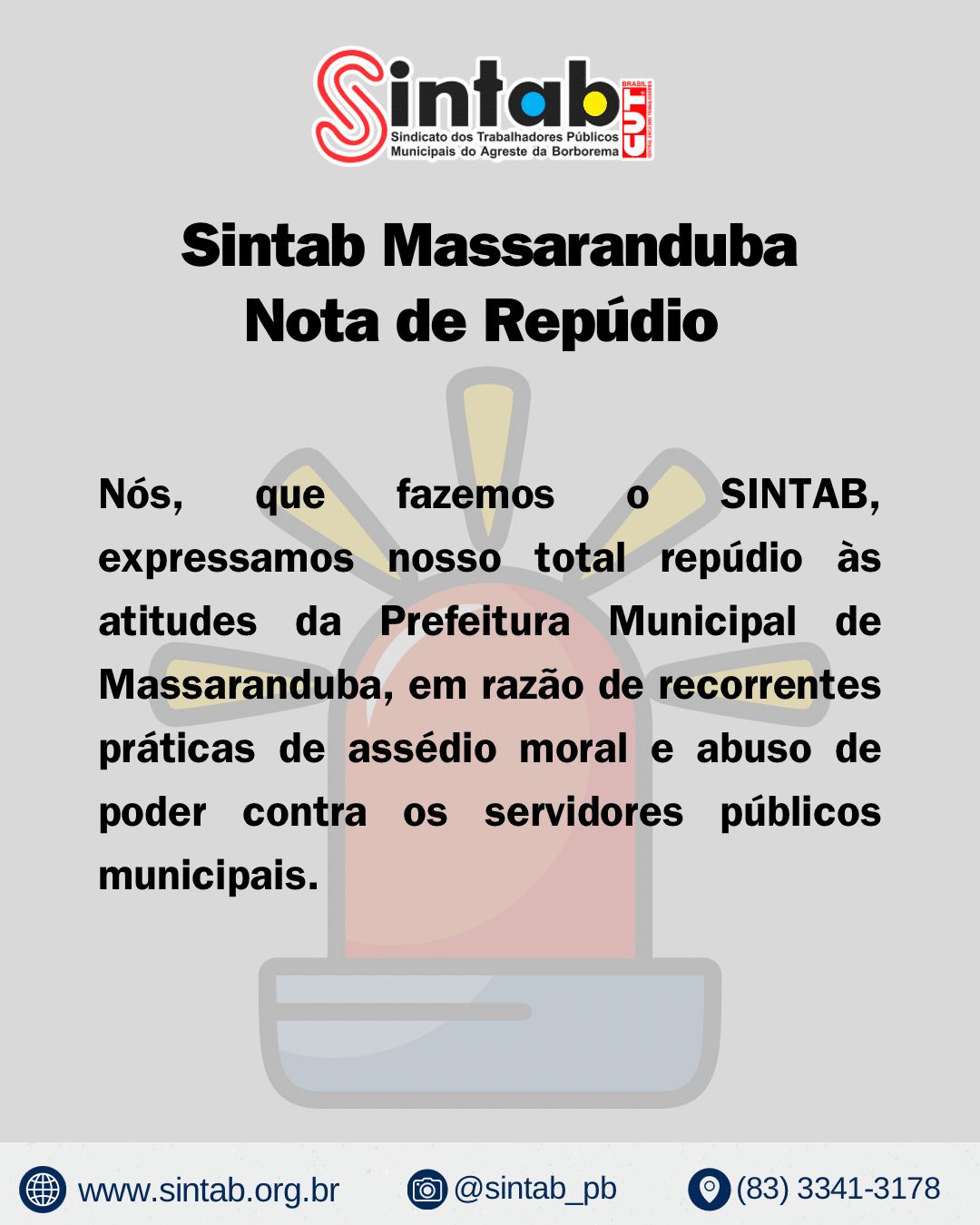 Nós, que fazemos o SINTAB, expressamos nosso total repúdio às atitudes da Prefeitura Municipal de Massaranduba, em razão de recorrentes práticas de assédio moral e abuso de poder contra os servidores públicos municipais.