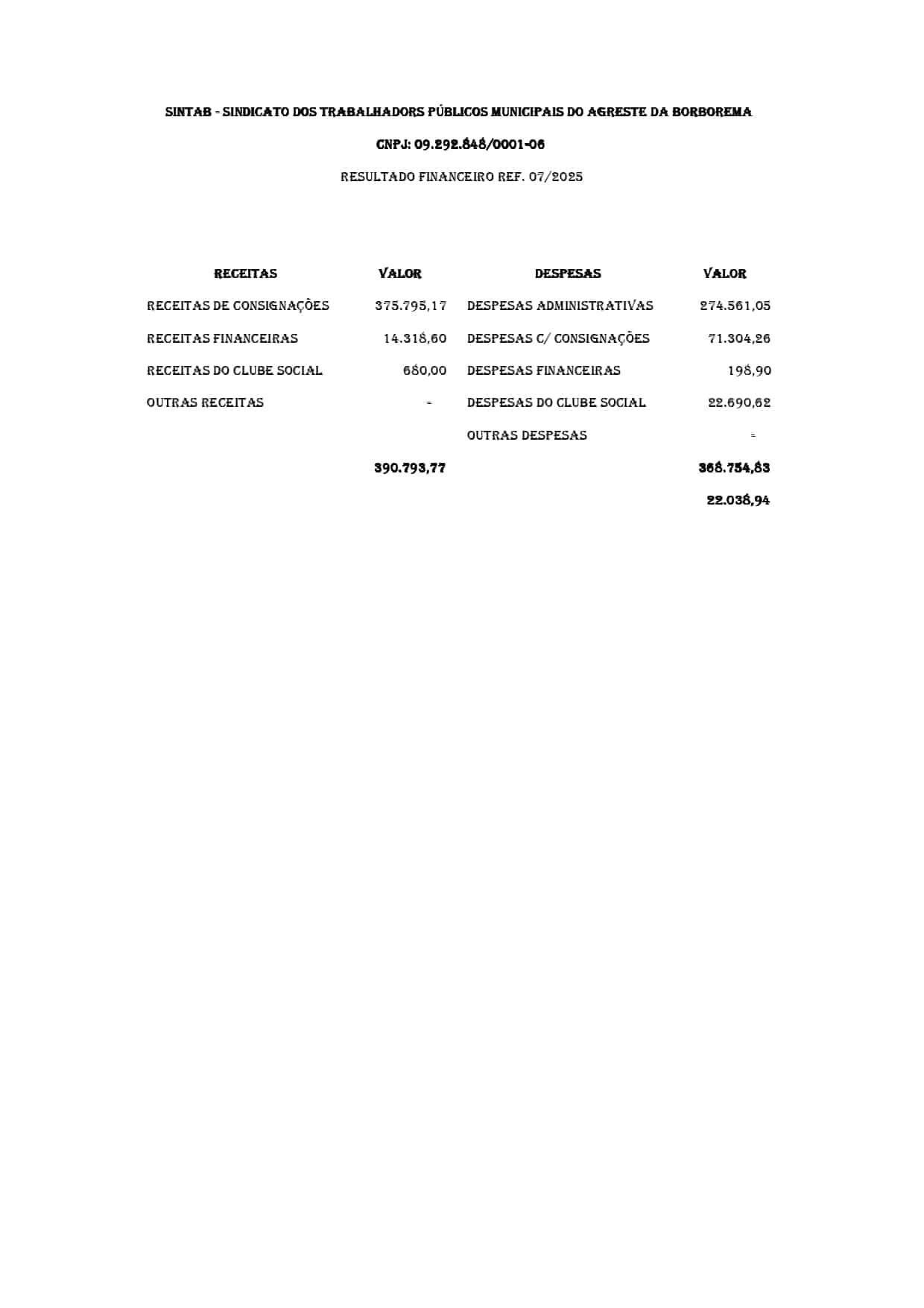 ✍️ Disponível a Prestação de Contas de JULHO de 2025 nas redes sociais e no site: sintab.org.br. SINTAB é Transparência. Quem quiser conferir com mais detalhes, basta solicitar a tesouraria ou a presidência, que os dados serão disponibilizados na íntegra.