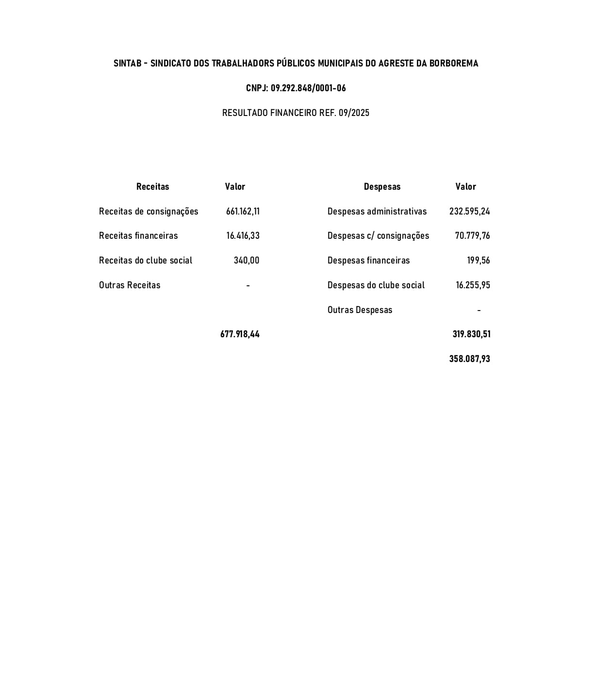 ✍️ Disponível a Prestação de Contas de SETEMBRO de 2025 nas redes sociais e no site: sintab.org.br. SINTAB é Transparência. Quem quiser conferir com mais detalhes, basta solicitar a tesouraria ou a presidência, que os dados serão disponibilizados na íntegra.